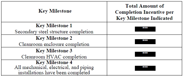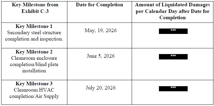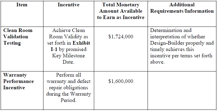 The Design-Build Agreement also provides for (i) schedule-based incentives tied to the timely achievement of specified key milestones up to $1,810,000 and (ii) performance-based incentives, including up to $1,724,000 tied to cleanroom validation testing and up to $1,600,000 tied to warranty performance, in each case subject to the conditions and determinations set forth in the Design-Build Agreement.