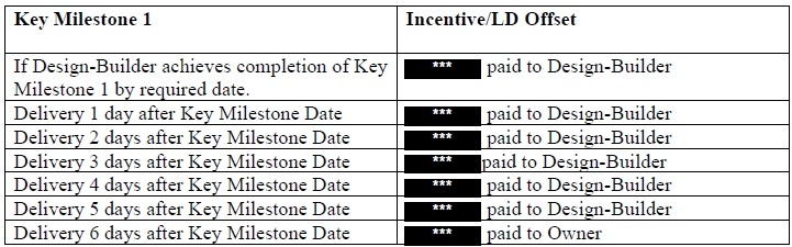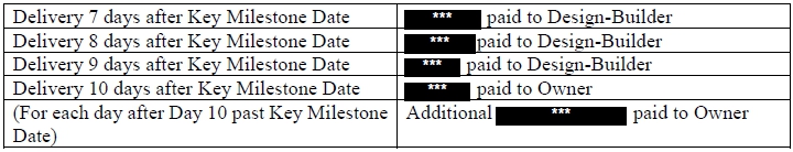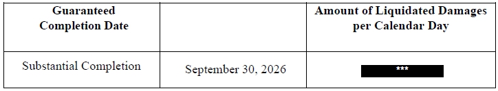 The Design-Build Agreement provides for liquidated damages in the event of delays in achieving specified key milestones or substantial completion, subject to contractual adjustments and conditions, with an aggregate liquidated damages cap of $1,600,000.