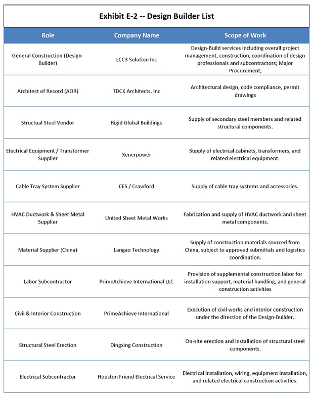 | Exhibit E-2 | List of Design-Builder’s Architect, Consultants, and Subcontractors |